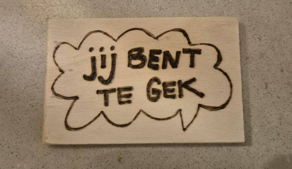 Tot slot eindigden we bij een houtvuurtje waar Christi de Heus van Studio Samen Buren een mooie boodschap overbracht: “Jij bent te gek”. Gebrand op een houten bordje en gemaakt door iemand die hierdoor mentale rust vindt.