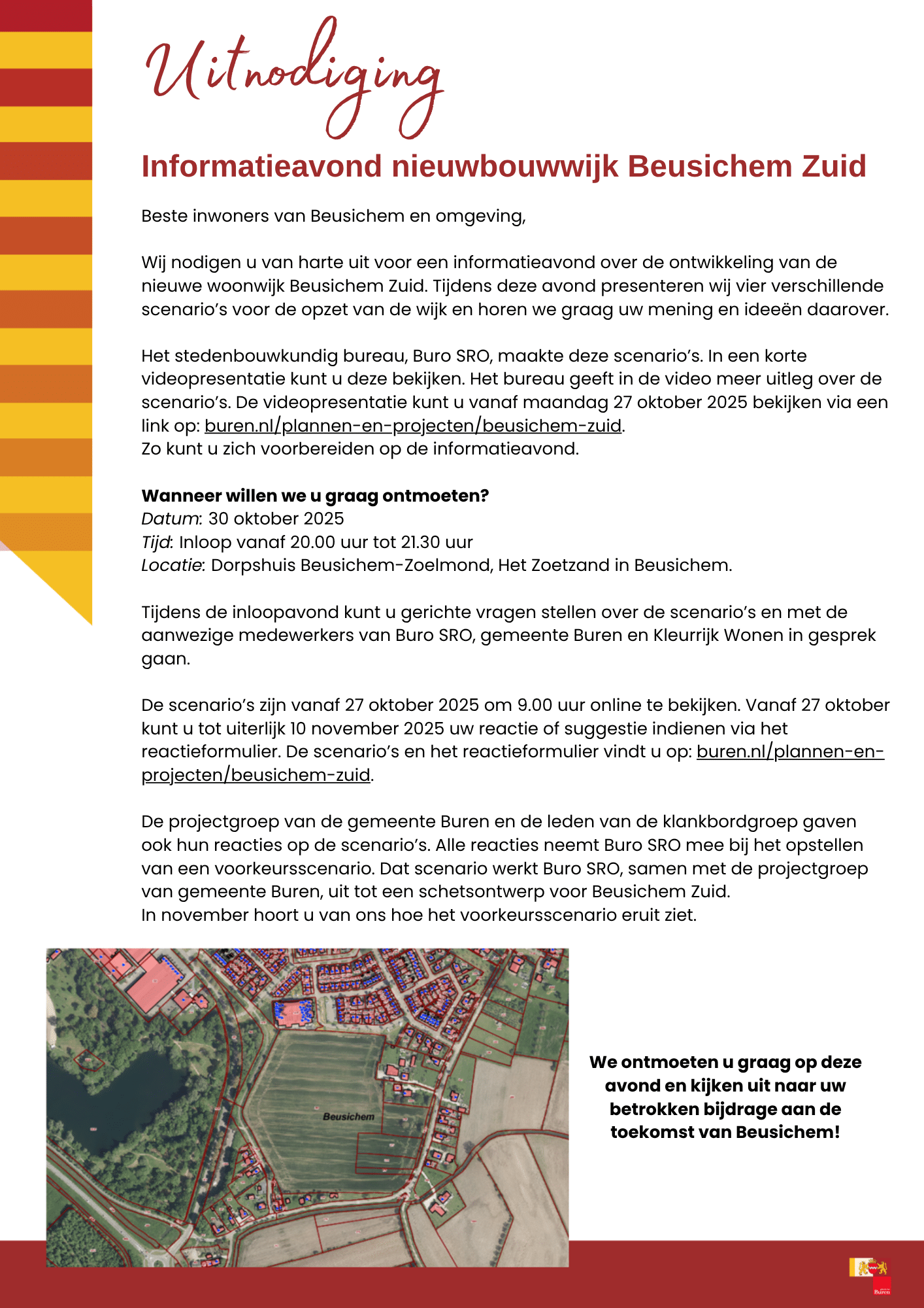 Wij nodigen u van harte uit voor een informatieavond over de ontwikkeling van de nieuwe woonwijk Beusichem Zuid. Tijdens deze avond presenteren wij vier verschillende scenario’s voor de opzet van de wijk en horen we graag uw mening en ideeën daarover.
