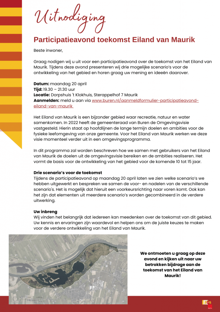 - Fase 2 (februari – april 2026): In deze fase zullen verschillende scenario’s voor de toekomst van het Eiland van Maurik worden uitgewerkt. Deze scenario’s worden breed besproken met inwoners, ondernemers, lokale maatschappelijke organisaties, Rijkswaterstaat en andere overheden. Na een zorgvuldige afweging van alle argumenten, voor en tegen de scenario’s, wordt een voorkeursscenario opgesteld, dat in fase 3 aan alle inwoners en betrokkenen wordt gepresenteerd.